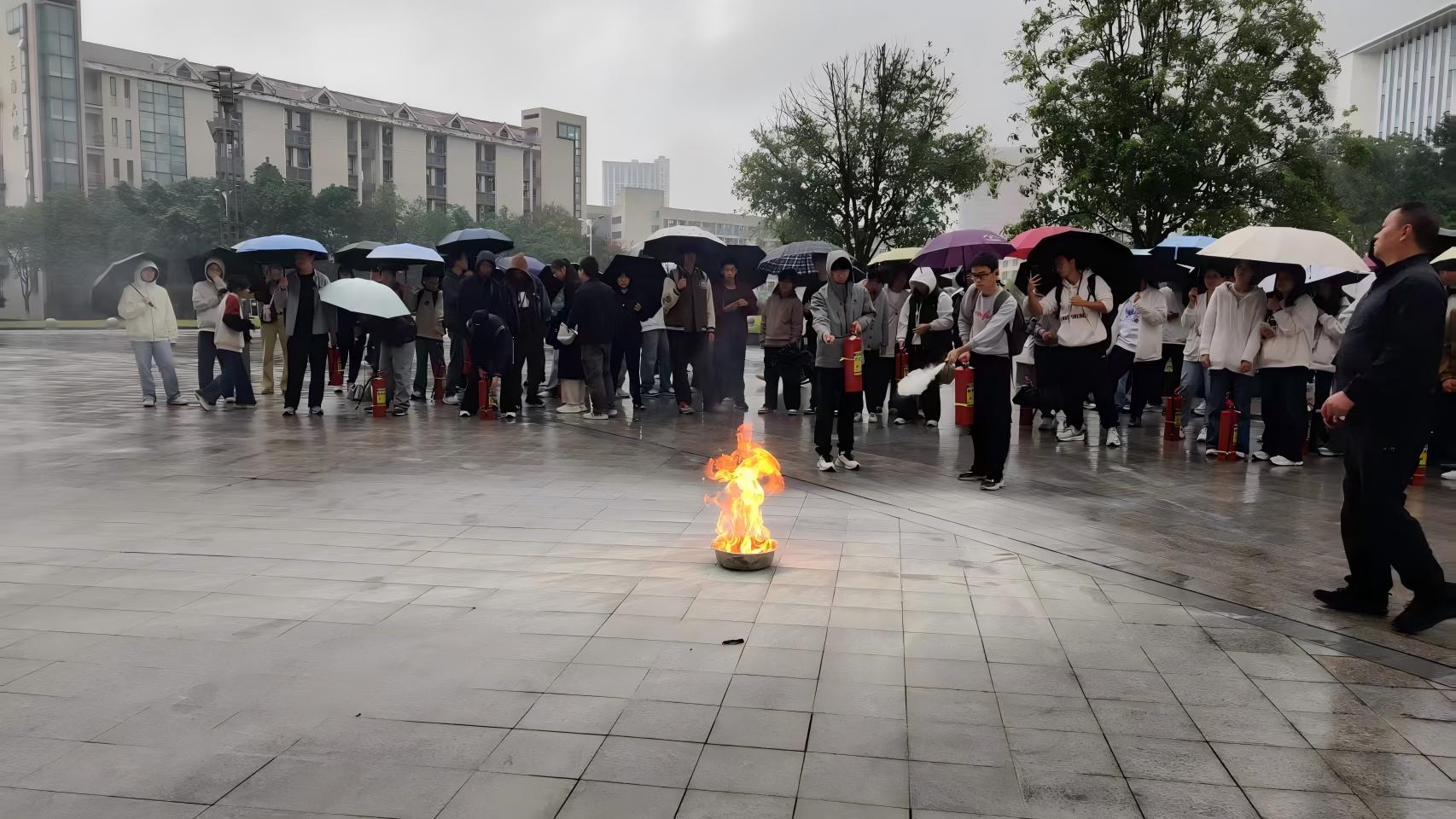 实验室安全事故演练之消防灭火实训演练在理科楼广场进行。首先,保卫处工作人员向学生详细讲解并示范灭火器、灭火毯等消防器材的正确操作方法及注意事项。随后,学生在保卫处工作人员的指导下分组进行实操,依次使用干粉灭火器、灭火毯扑灭石油醚燃烧的火焰。通过亲身体验,学生不仅掌握了常见消防器具的正确使用方法,还锻炼了消防灭火能力,提高应对初起火灾的实战水平。